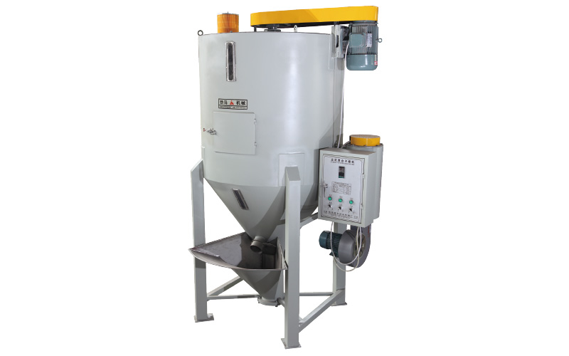 立式混合干燥機是利用螺桿的快速旋轉將原料從桶體底部由中心提升至頂端,再以傘狀飛拋散落,回至底部。原料在桶內不停的翻滾,熱風不停的從中心輸送從而達到混合與干燥的同步進行,節省時間和能源。如不需干燥,只要關掉干燥開關,僅使用混合機功能。本機適用于干粒料、破碎料和色母料的混合。